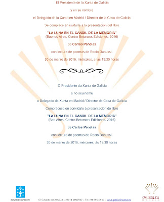 Carlos Penelas presentará La luna en el candil de la memoria en la Casa de Galicia en Madrid. Será el miércoles 30 de marzo a las 19:30 horas. La presentación estará a cargo de D. Ramón Jiménez Pérez, Coordinador de Actividades Culturales de la Casa. Leerá poemas Rocío Danussi.